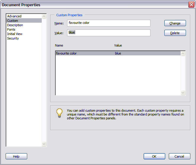a set of name value pairs stored within the PDF file. In Acrobat 6.0 these properties can be viewed